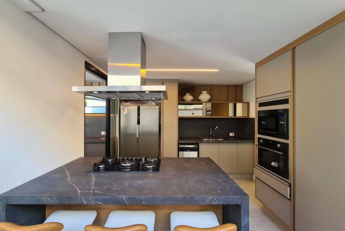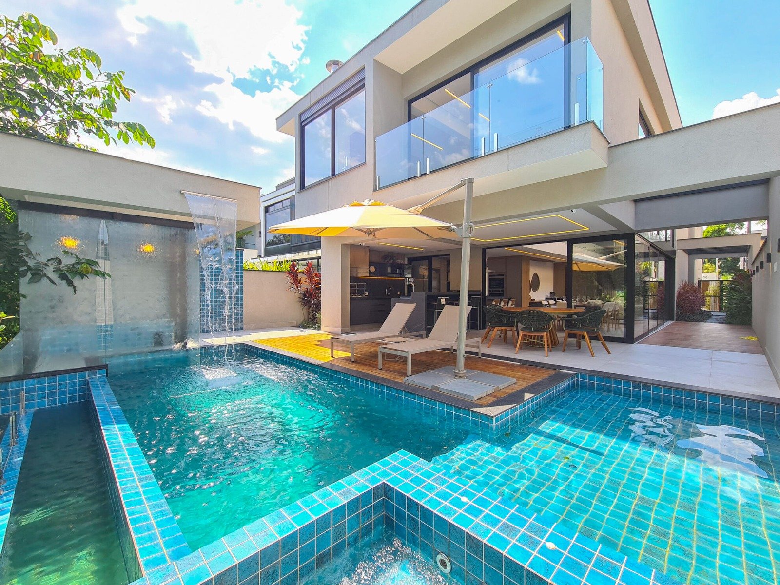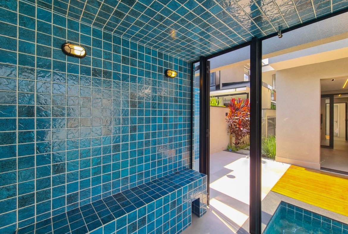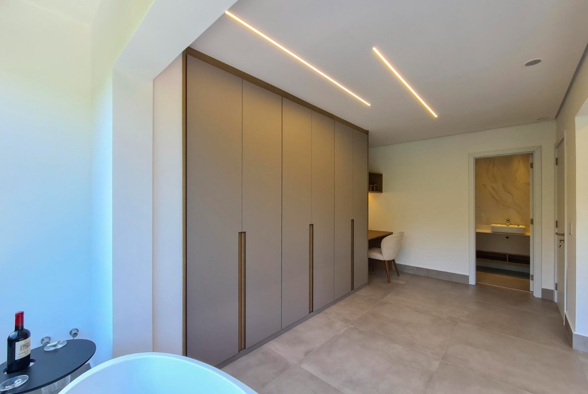 Revestimento Portobello / Metais docol / Chopeira / Cervejeira / Adega / Lavabos (interno/externo) / Ar-condicionado em todos os ambientes / Cachoeira e espelho da água / Aquecimento solar fotovoltaica / Marcenaria Todeschini / Eletrodomésticos / Eletroeletrônicos / Persianas elétricas / Cortina elétrica / Alexia, acionamento inteligente / Bancadas e escada em dekton.
