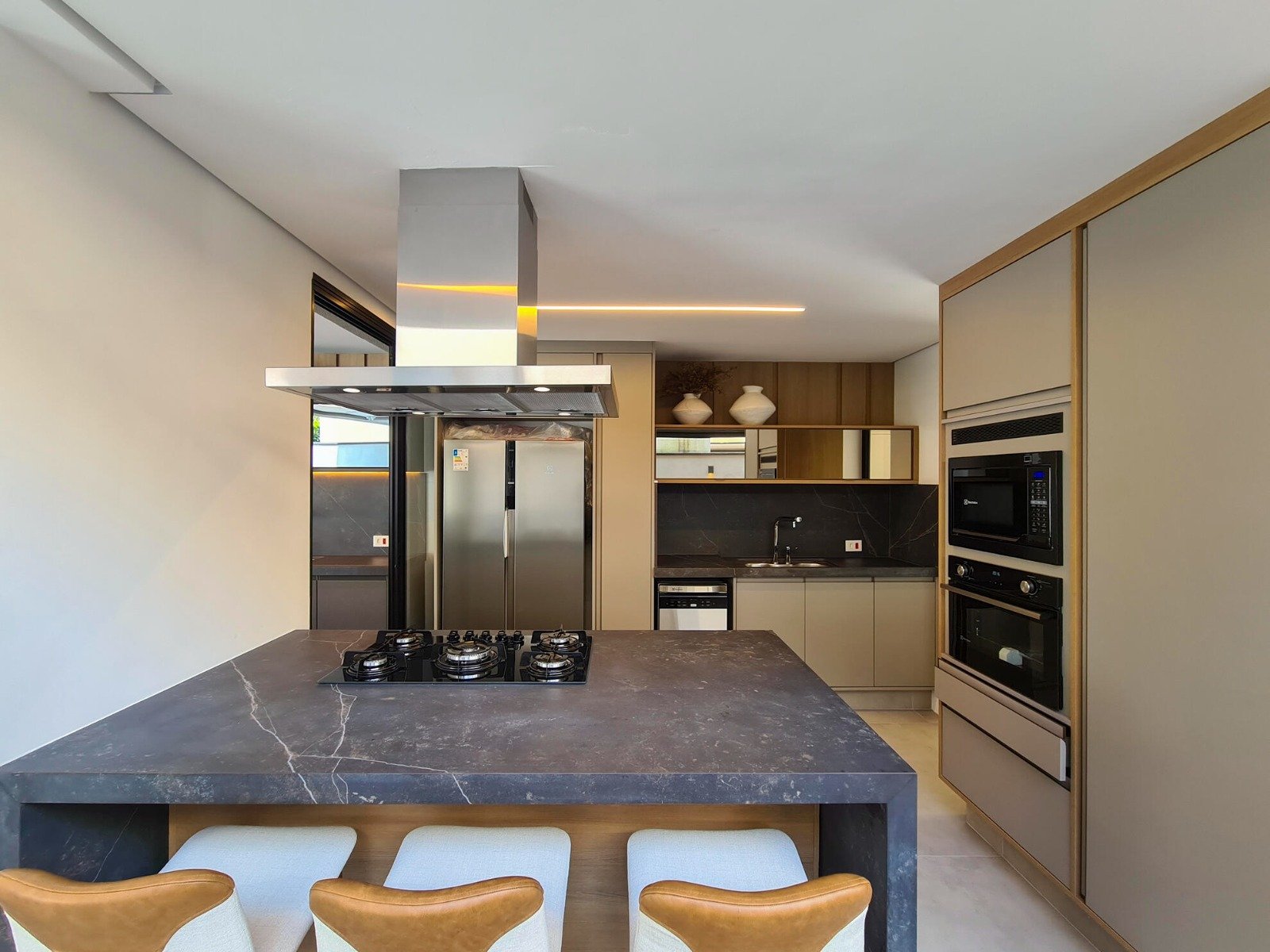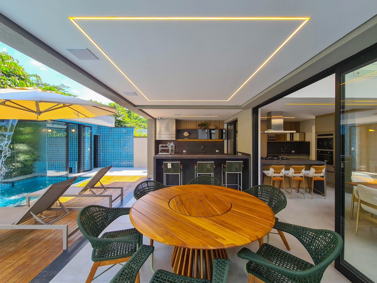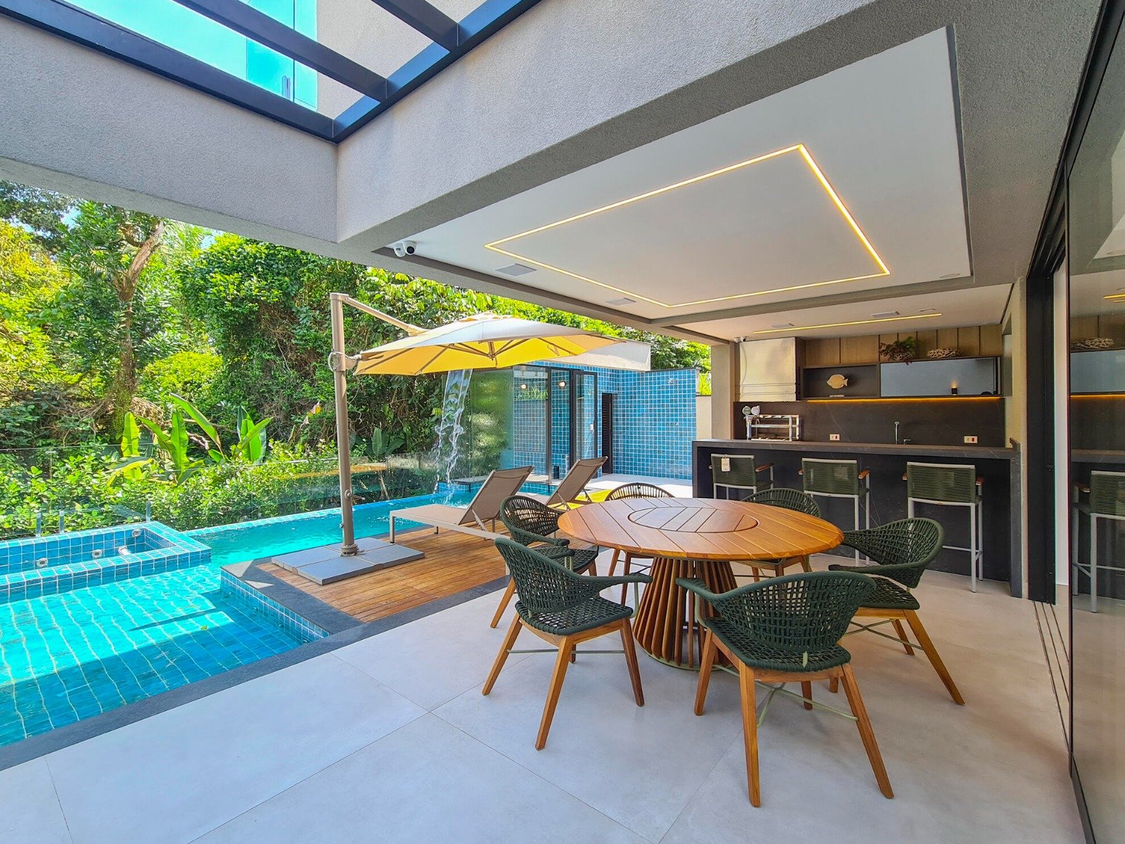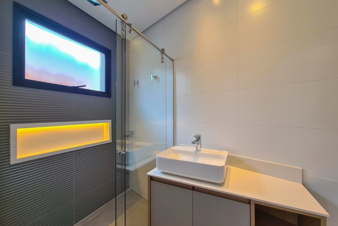 Revestimento Portobello / Metais docol / Chopeira / Cervejeira / Adega / Lavabos (interno/externo) / Ar-condicionado em todos os ambientes / Cachoeira e espelho da água / Aquecimento solar fotovoltaica / Marcenaria Todeschini / Eletrodomésticos / Eletroeletrônicos / Persianas elétricas / Cortina elétrica / Alexia, acionamento inteligente / Bancadas e escada em dekton.