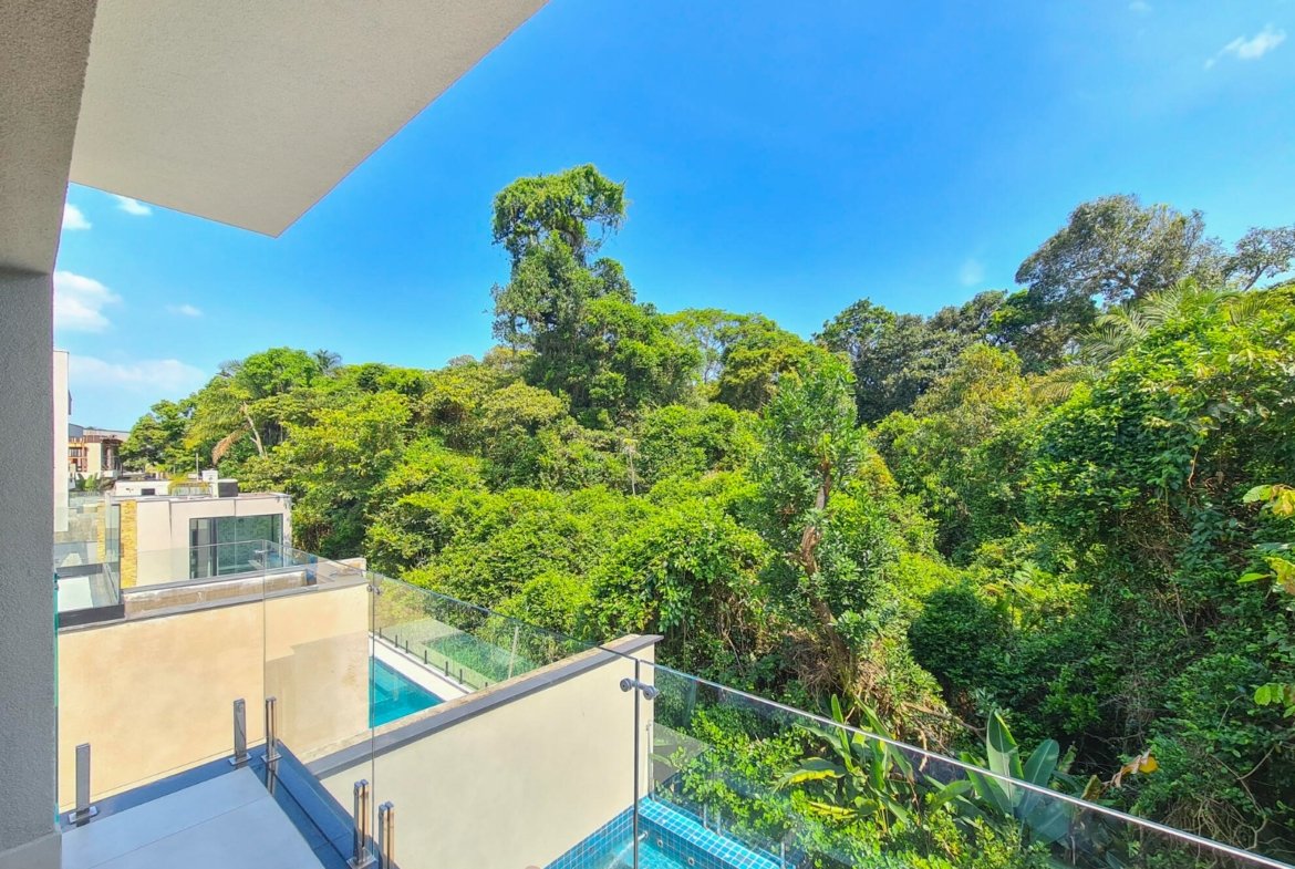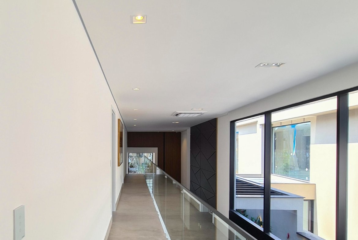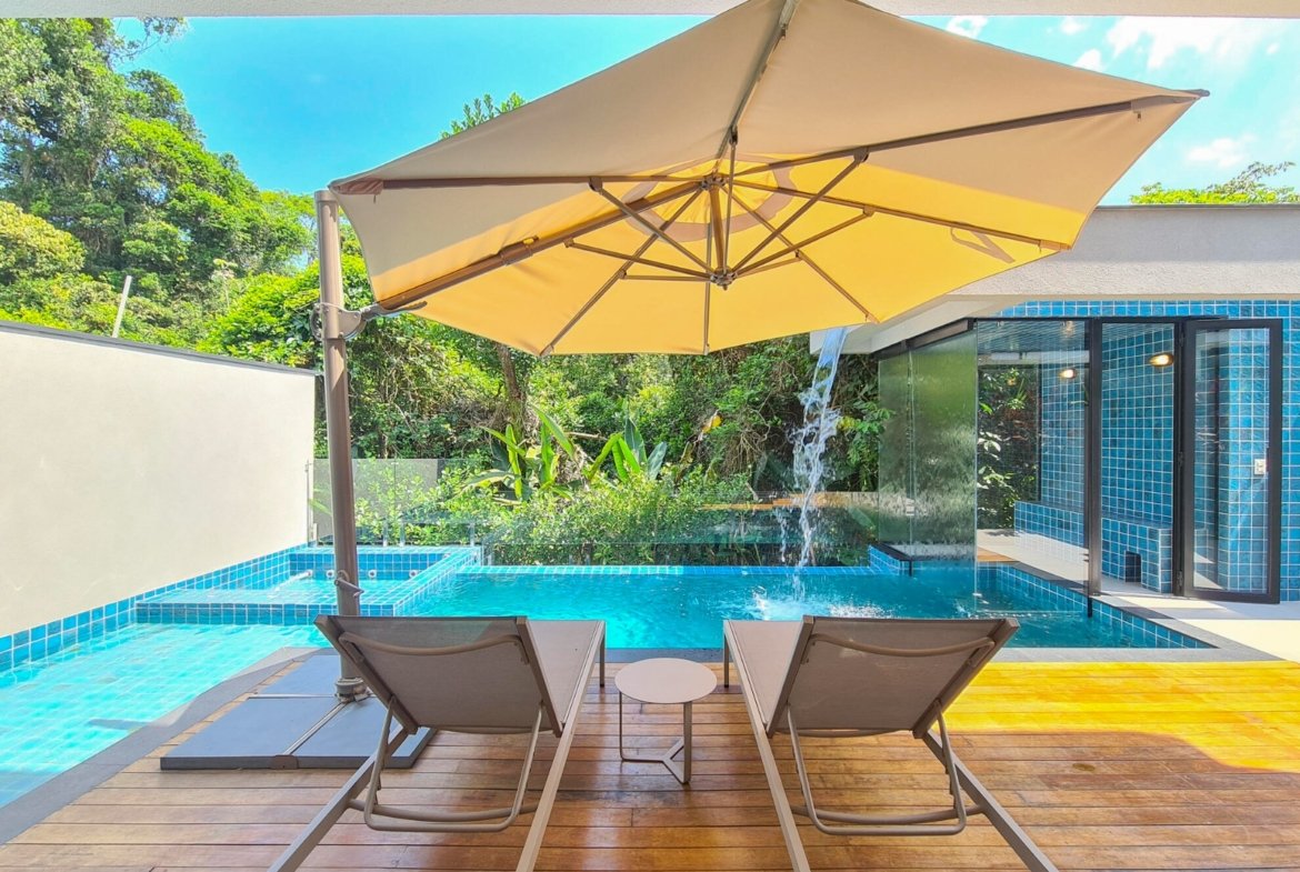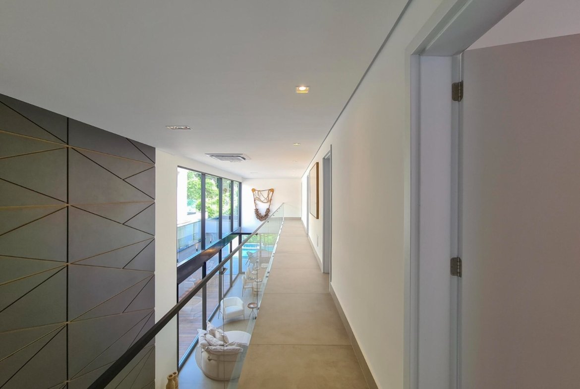 Ao todo são 5 suítes amplas, sendo a principal com terraço e vista para a mata e piscina. Extremamente aconchegante, tudo dentro da residência é especial, desde o living para 3 ambientes, lavabo, cozinha americana até a sua suíte de apoio para funcionários.