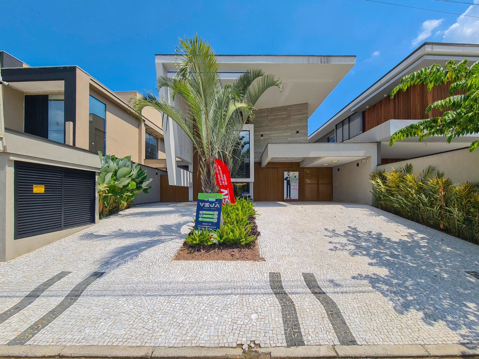 Por fora, não poderia ser diferente, sua frente imponente em balanço sem vigas e 5 vagas de garagem.